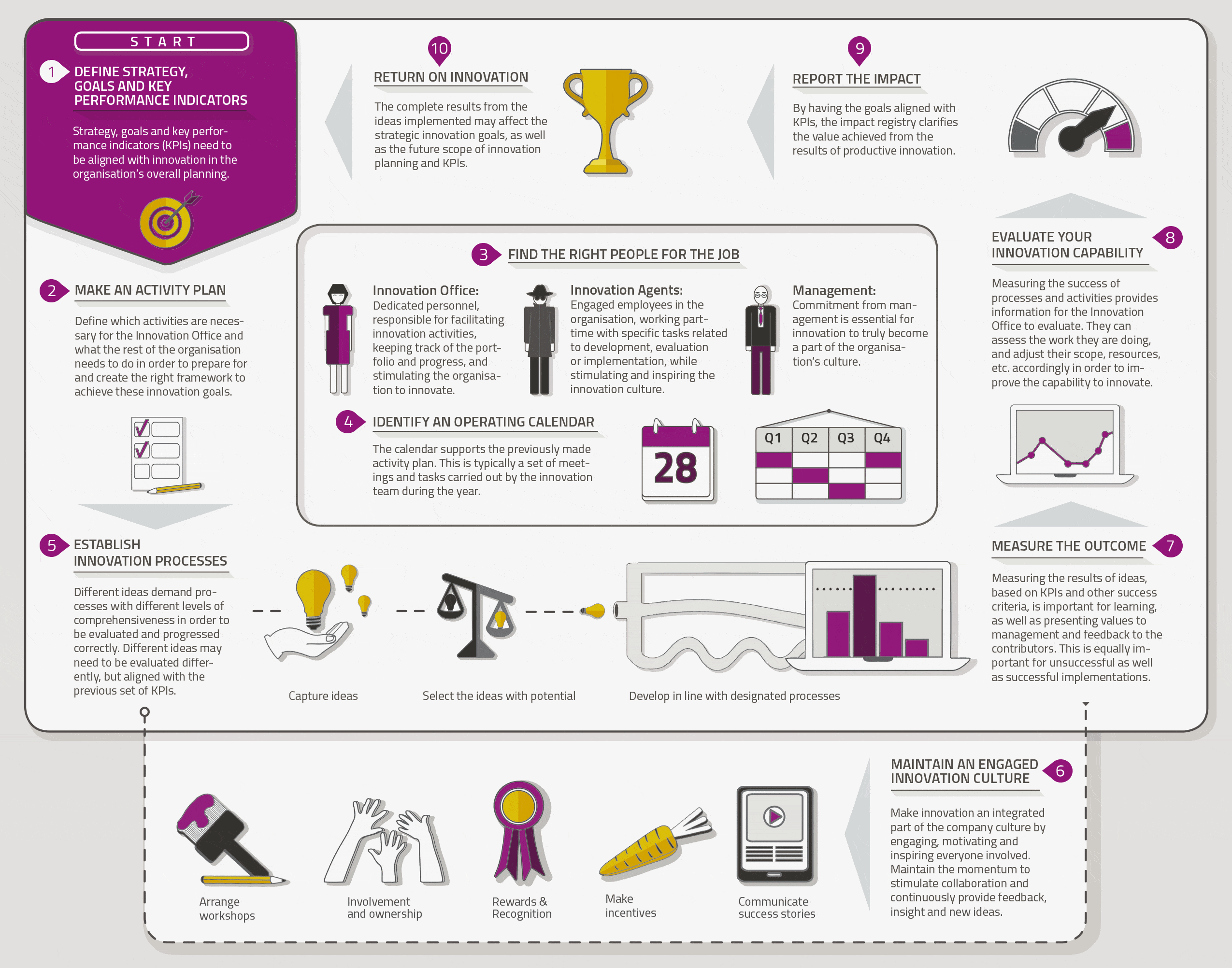 No basta con tener una herramienta de gestión de la innovación, de hecho, de poco servirá si la organización no trabaja cada uno de los siguientes 10 pasos: