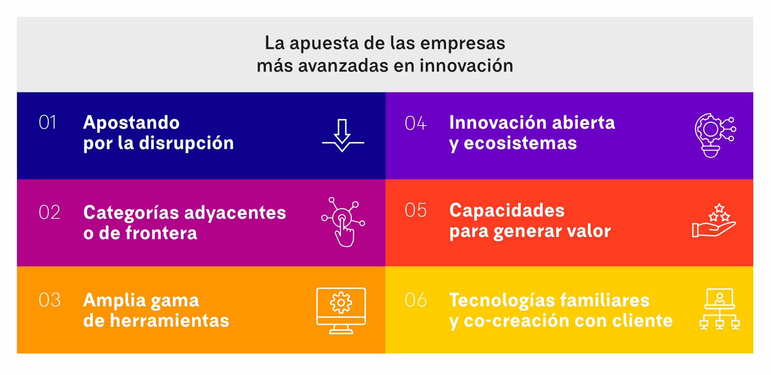 - Innovación abierta y ecosistemas. Siguiendo con las “empresas avanzadas”, despliegan de forma clara estrategias de innovación abierta y es más probable que lideren o participen en ecosistemas, colaborando con socios externos -e incluso competidores- para el desarrollo de sus innovaciones.