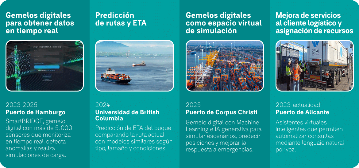 Esta tendencia habilita la predicción de flujos, la optimización dinámica de recursos, la simulación de incidencias y la mejora continua de los servicios logísticos, incrementando la resiliencia y la capacidad de anticipación del puerto.