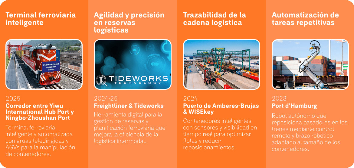La presión competitiva, acelera la automatización de tareas y procesos, mejora trazabilidad de la cadena logística a través de smart containers y digitaliza terminales ferroviarias enteras; incluyendo robots colaborativos que permiten optimizar tiempos, reducir costes operativos y minimizar errores.