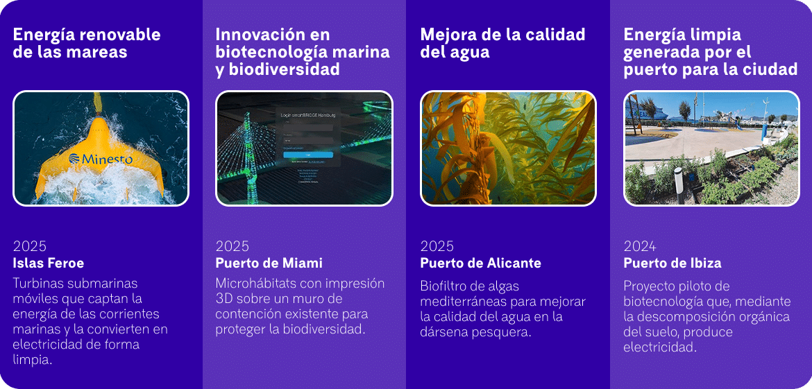 Incluye el desarrollo de energías marinas renovables, biotecnología, proyectos de mejora de la calidad del agua y soluciones que conectan el puerto con la ciudad a través de energía limpia y servicios ambientales.