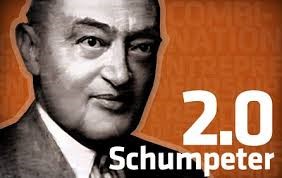 Schumpeter i els emprenedors Schumpeter va elaborar la teoria de la concepció cíclica i irregular del desenvolupament capitalista, elaborada el 1911 a la seva Teoria der wirtschaftlichen Entwicklung ( ‘Teoria del desenvolupament econòmic’) mentre feia classes a Czernowitz (actual Chernivtsi, a Ucraïna). En ella recull la seva teoria de l’«esperit emprenedor» (Unternehmergeist), propi dels emprenedors, que creen innovacions tècniques i financeres en un mitjà competitiu en el qual han d’assumir continus riscos i rebre beneficis que no sempre es mantenen en el temps. |