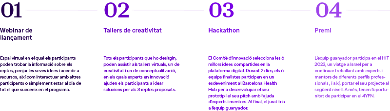 Fhutura va brindar l’oportunitat a tots els professionals sanitaris de participar en dos tallers de creativitat en línia. Els tallers tenien com a objectiu generar i desenvolupar en profunditat idees innovadores per a resoldre els tres reptes plantejats en el programa, a través de tècniques de contextualització, ideació i conceptualització.