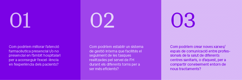 Per a això, es van definir 3 reptes d’innovació a través d’un procés participatiu en el qual es va tenir en compte el coneixement i treball previ de la SEFH per a detectar reptes de farmàcia hospitalària, les necessitats de pacients de diferents àrees terapèutiques i d’àmbit nacional, així com les aportacions de Gerents d’Hospital i Caps del Servei de Farmàcia Hospitalària de tres hospitals amb perfils diferents i representació geogràfica nacional: