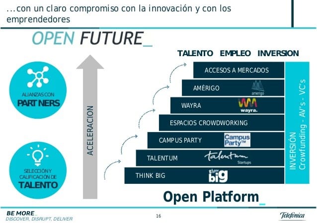 Telefónica ha apostado por el talento y el emprendimiento como piezas clave de su proceso de innovación. Por ello, la compañía ha creado Telefónica Open Future, un programa global y abierto diseñado para conectar a emprendedores, startups, inversores y organizaciones públicas y privadas de todo el mundo, que integra todas las iniciativas de apoyo a la innovación abierta y el emprendimiento de la compañía como Wayra, Talentum o Think Big y las herramientas de inversión como Amérigo y Telefónica Ventures.